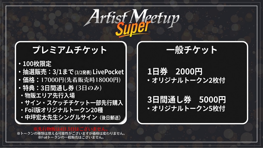 物販先行入場券(スケッチ入りアーティストプルーフは物販エリアで販売します) ※物販先行入場は4月3日のみ行います。販売アイテムの補充がありませんので、4日, 5日は行いません。 ※スケッチ入りアーティストプルーフの数量は未定です。 プレミアムチケット向けサイン・スケッチチケット先行販売 Foil版オリジナルトークン20種(※foil版の一般販売はございません。トークンの種類はまだ増える可能性がありますが、チケットの価格は変わりません。) 中坪宏太先生シングルサイン(後日郵送) |